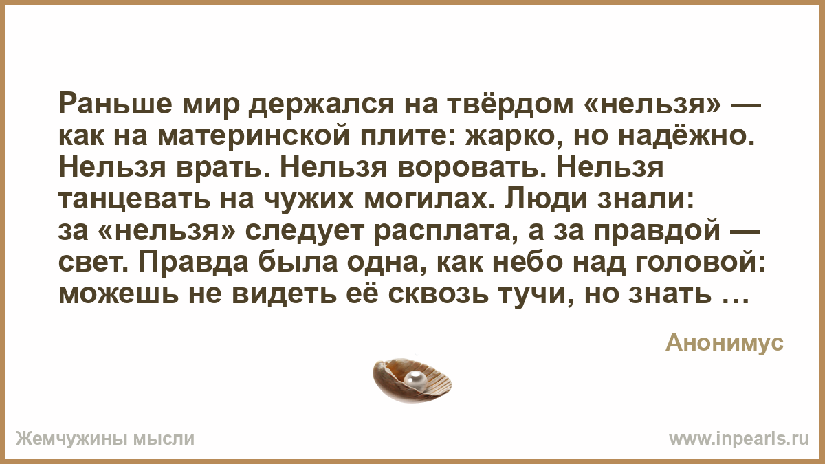 Раньше мир держался на твёрдом «нельзя» — как на материнской плите: жарко, но надёжно. Нельзя врать. Нельзя воровать. Нельзя танцевать на чужих могилах. Люди знали: за «нельзя» следует расплата, а за правдой — свет. Правда была одна, как небо над головой: можешь не видеть её сквозь тучи, но знать — она есть.