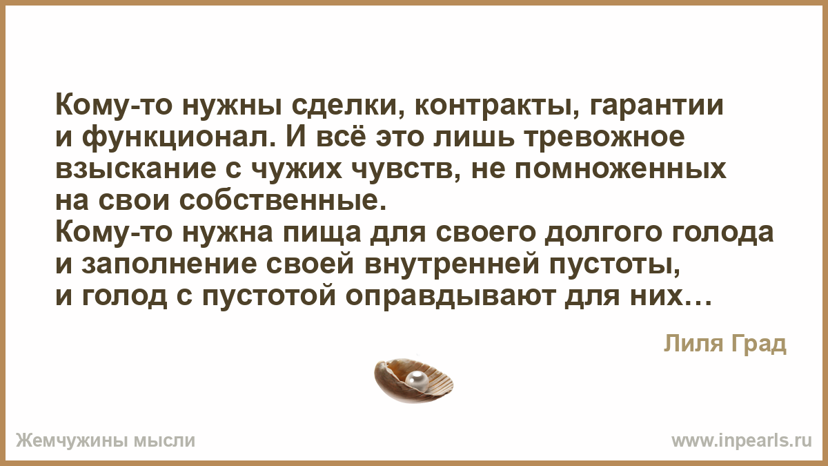 Кому-то нужны сделки, контракты, гарантии и функционал. И всё это лишь тревожное взыскание с чужих чувств, не помноженных на свои собственные.