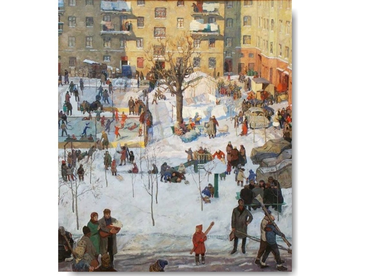 Жизнь кипит! Вот грузовик с мебелью приехал — похоже, привезли пианино. Вот народ толпится с цветами — приехали жених и невеста! Невеста в фате и белых туфельках (как отмечено френдом в комментах). Вот под деревом женская группа с колясками (кстати, двух типов — с низкой посадкой овальные и с высокой посадкой прямоугольные; еще одна прямоугольная коляска стоит на балконе). Вот мужики режутся в домино. Вот каток с хоккеистами, фигуристами и непременной родительской кучкой в уголке. Вот горка — и тоже с родителями рядом. Еще песочница-грибок — за неимением песка в машинку нагружают снег. Еще снежная баба для девчонок и снежная крепость для мальчишек, для них же игра в снежки.