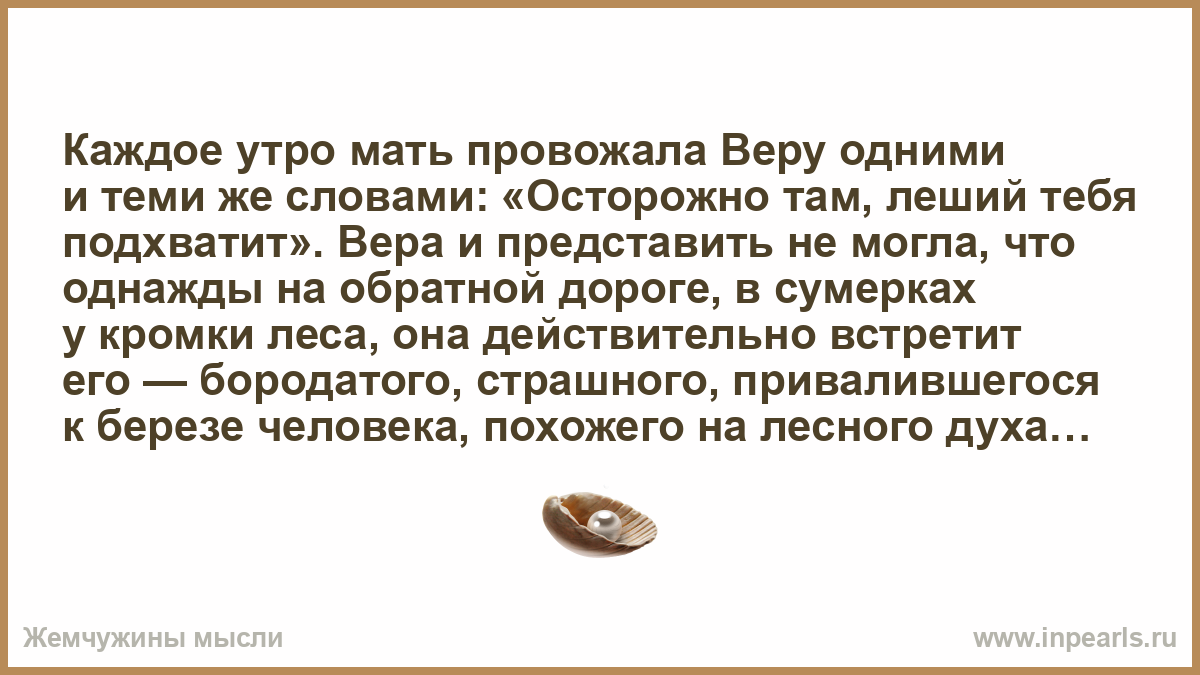 — А помнишь, Вер, — вдруг сказала мать. — Как я тебе говорила: «Осторожно там, ходишь мимо лесу-то! Леший тебя возьми»?