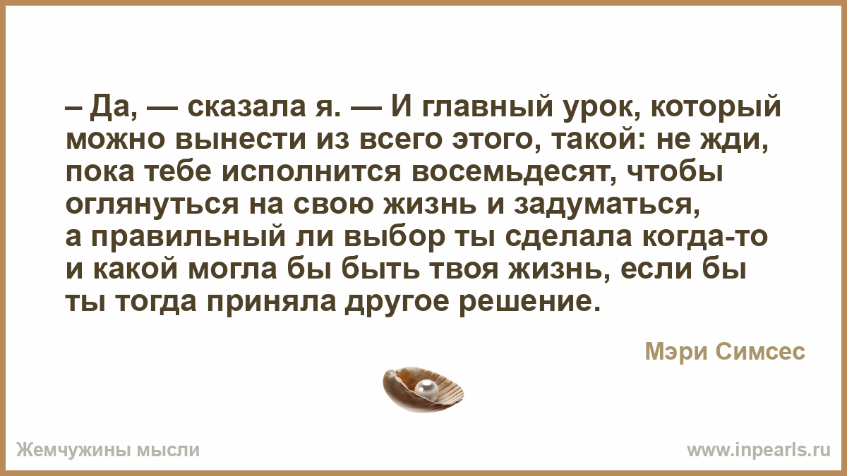 – Да, — сказала я. — И главный урок, который можно вынести из всего этого, такой: не жди, пока тебе исполнится восемьдесят, чтобы оглянуться на свою жизнь и задуматься, а правильный ли выбор ты сделала когда-то и какой могла бы быть твоя жизнь, если бы ты тогда приняла другое решение.