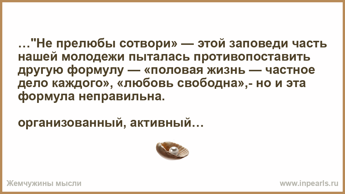 …"Не прелюбы сотвори» — этой заповеди часть нашей молодежи пыталась противопоставить другую формулу — «половая жизнь — частное дело каждого», «любовь свободна»,- но и эта формула неправильна.