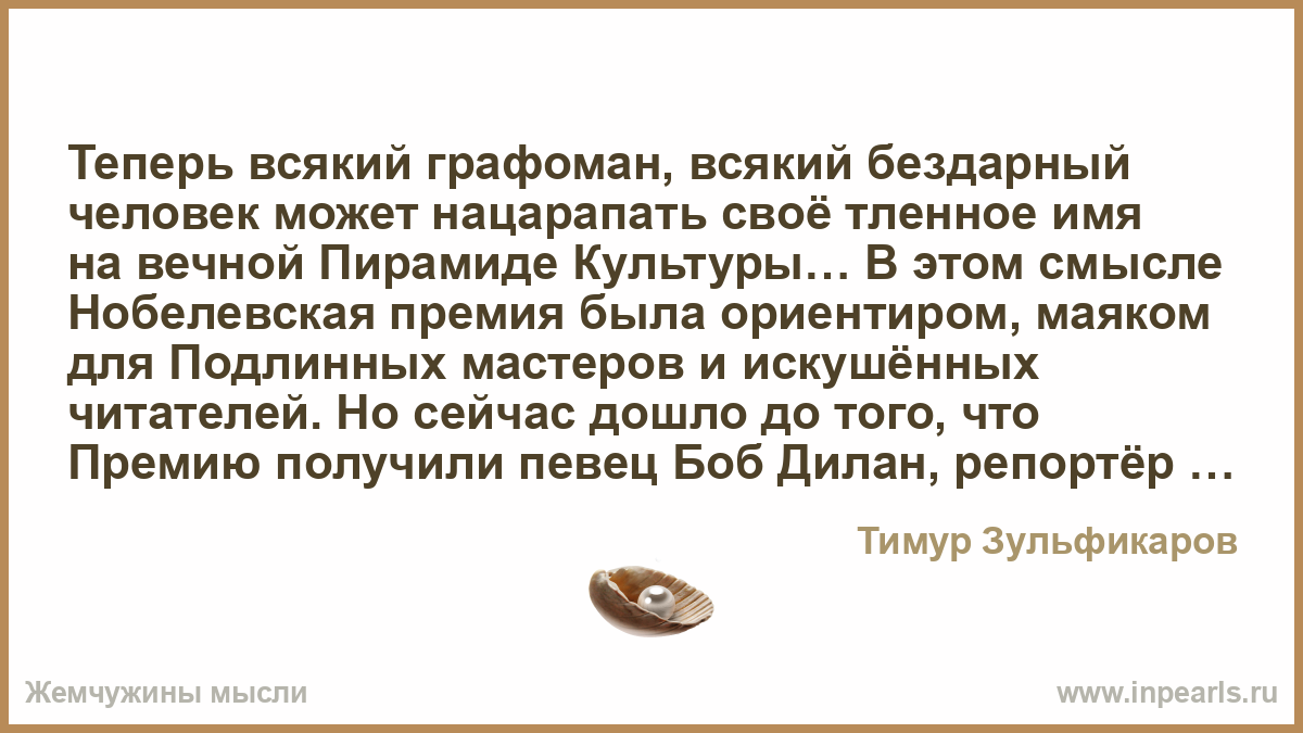 Теперь всякий графоман, всякий бездарный человек может нацарапать своё тленное имя на вечной Пирамиде Культуры… В этом смысле Нобелевская премия была ориентиром, маяком для Подлинных мастеров и искушённых читателей. Но сейчас дошло до того, что Премию получили певец Боб Дилан, репортёр — журналист Светлана Алексиевич, явная поэтическая графоманка Ольга Токарчук, не имеющие никакого отношения к тому высокому идеализму, о котором говорил основоположник Премии Альфред Нобель.