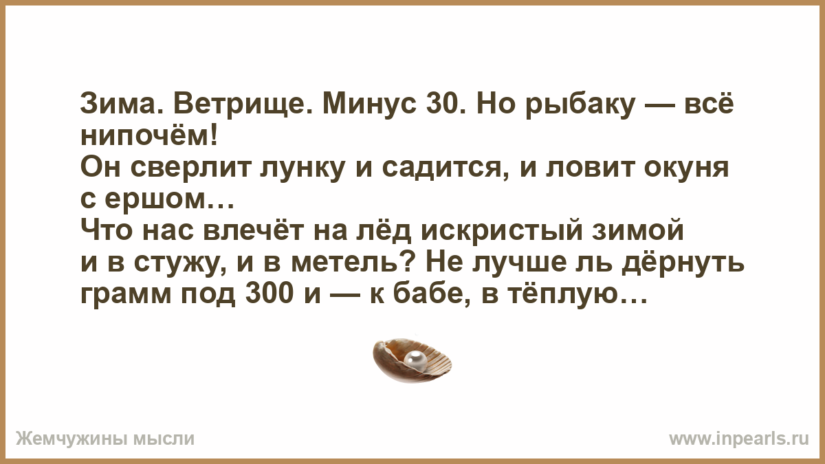 Порой набуришься до глюков, поймаешь рыбки ни на грош, попьёшь чайку и скажешь: «сука! Ведь как же сам процесс хорош!» Под вечер, поморозив попку, домой стремишься поскорей. Мечтаешь, как пойдёт под стопку уха из свежих окуней!