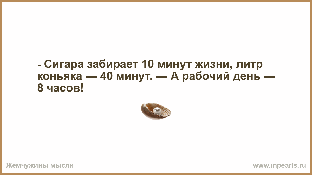 - Сигара забирает 10 минут жизни, литр коньяка — 40 минут. — А рабочий день — 8 часов!