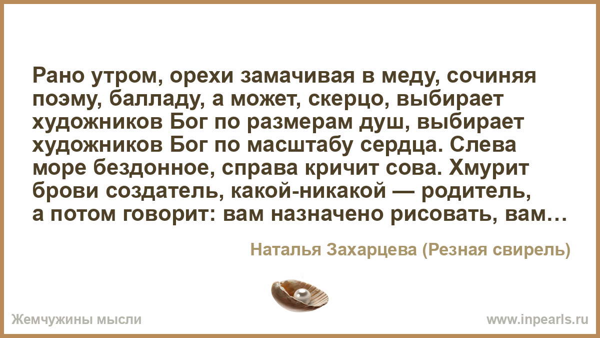Рано утром, орехи замачивая в меду, сочиняя поэму, балладу, а может, скерцо, выбирает художников Бог по размерам душ, выбирает художников Бог по масштабу сердца. Слева море бездонное, справа кричит сова. Хмурит брови создатель, какой-никакой — родитель, а потом говорит: вам назначено рисовать, вам назначены краски. Потом говорит: идите.