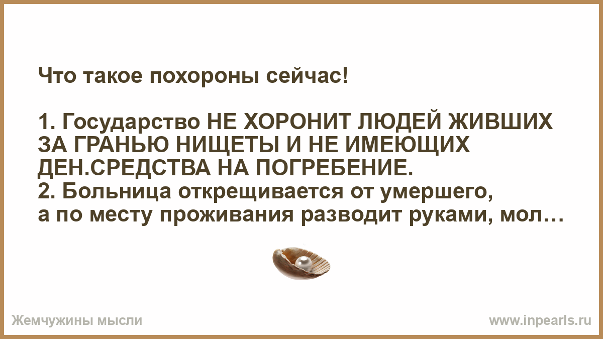 1. Государство НЕ ХОРОНИТ ЛЮДЕЙ ЖИВШИХ ЗА ГРАНЬЮ НИЩЕТЫ И НЕ ИМЕЮЩИХ ДЕН.СРЕДСТВА НА ПОГРЕБЕНИЕ.