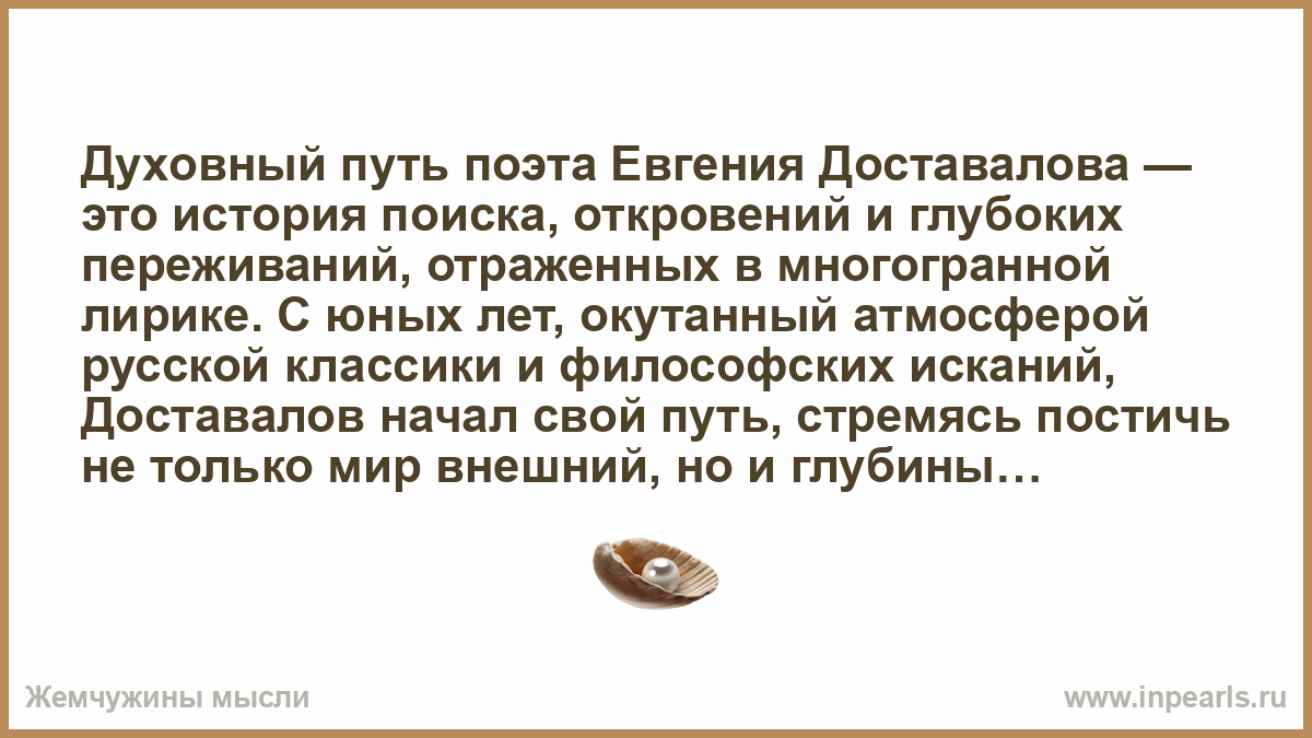Духовный путь поэта Евгения Доставалова — это история поиска, откровений и глубоких переживаний, отраженных в многогранной лирике. С юных лет, окутанный атмосферой русской классики и философских исканий, Доставалов начал свой путь, стремясь постичь не только мир внешний, но и глубины собственной души.