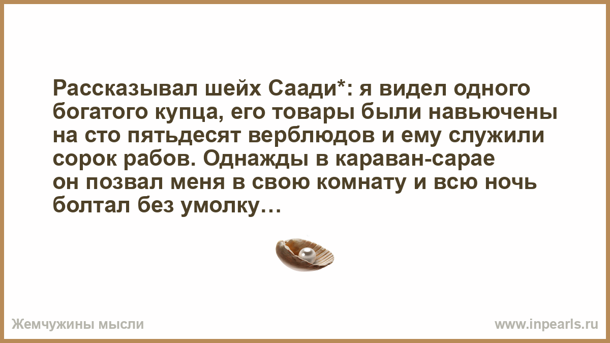 Рассказывал шейх Саади*: я видел одного богатого купца, его товары были навьючены на сто пятьдесят верблюдов и ему служили сорок рабов. Однажды в караван-сарае он позвал меня в свою комнату и всю ночь болтал без умолку.
