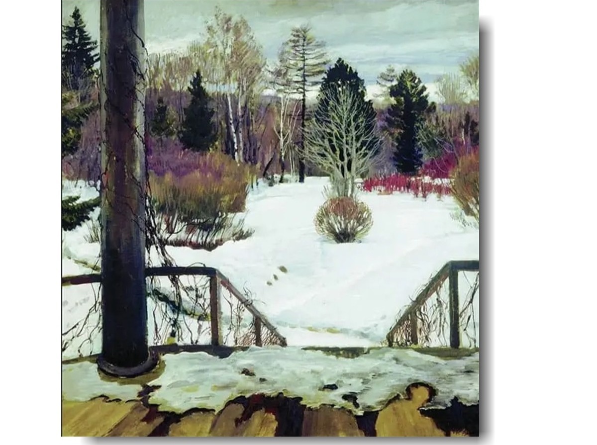 Художник смотрит на мир вокруг с невысокого крыльца загородного дома. Поэтому на переднем плане полотна слева можно увидеть тёмную, увитую сухим плющом колонну. Внизу по центру разместился покрытый талым снегом дощатый пол веранды. От него вниз уходят узкие деревянные перила, ведущие в живописный сад. Их также украшают стебли сухого плюща.