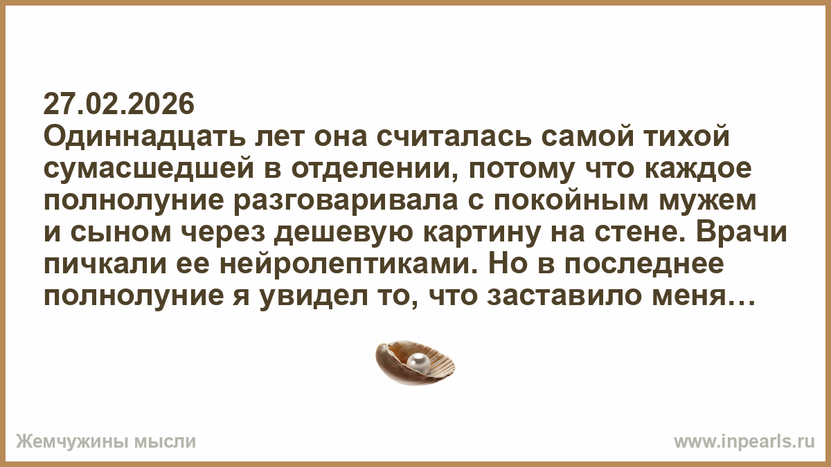 Одиннадцать лет она считалась самой тихой сумасшедшей в отделении, потому что каждое полнолуние разговаривала с покойным мужем и сыном через дешевую картину на стене. Врачи пичкали ее нейролептиками. Но в последнее полнолуние я увидел то, что заставило меня навсегда поверить