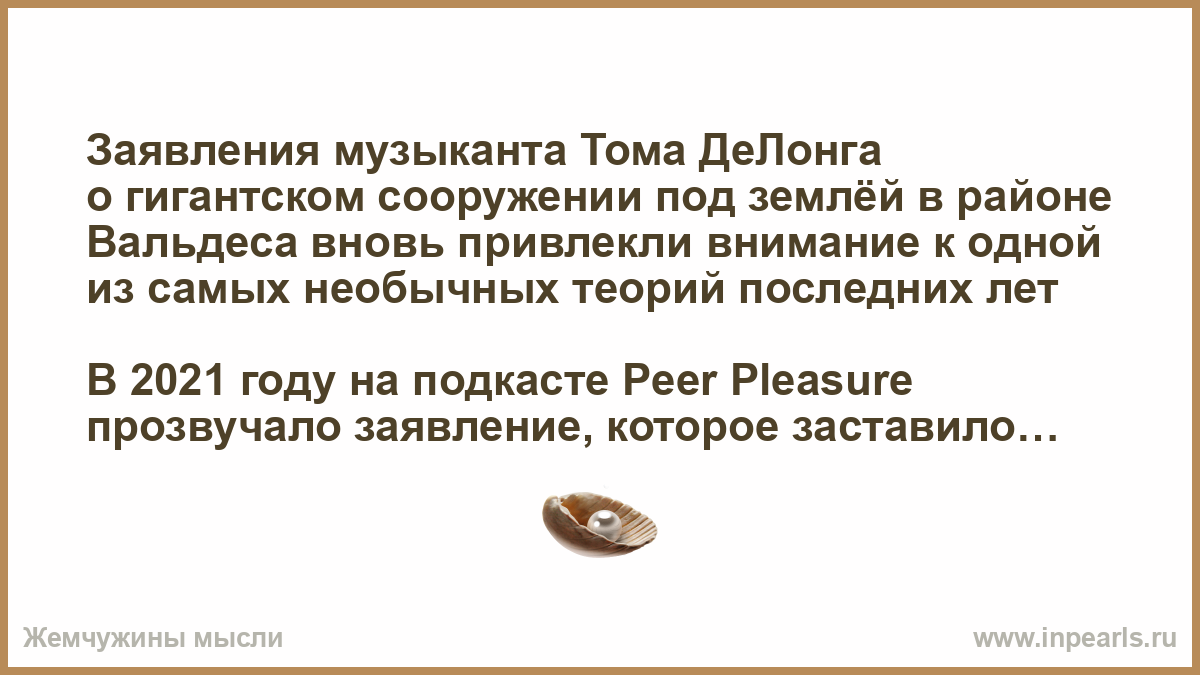 Заявления музыканта Тома ДеЛонга о гигантском сооружении под землёй в районе Вальдеса вновь привлекли внимание к одной из самых необычных теорий последних лет