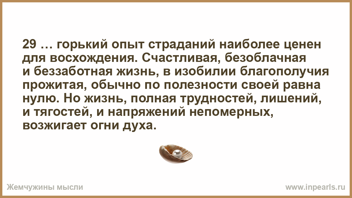 29 … горький опыт страданий наиболее ценен для восхождения. Счастливая, безоблачная и беззаботная жизнь, в изобилии благополучия прожитая, обычно по полезности своей равна нулю. Но жизнь, полная трудностей, лишений, и тягостей, и напряжений непомерных, возжигает огни духа.