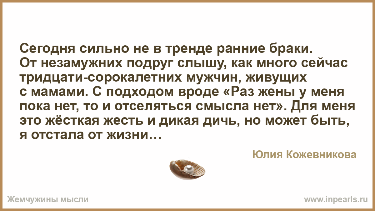 Сегодня сильно не в тренде ранние браки. От незамужних подруг слышу, как много сейчас тридцати-сорокалетних мужчин, живущих с мамами. С подходом вроде «Раз жены у меня пока нет, то и отселяться смысла нет». Для меня это жёсткая жесть и дикая дичь, но может быть, я отстала от жизни?