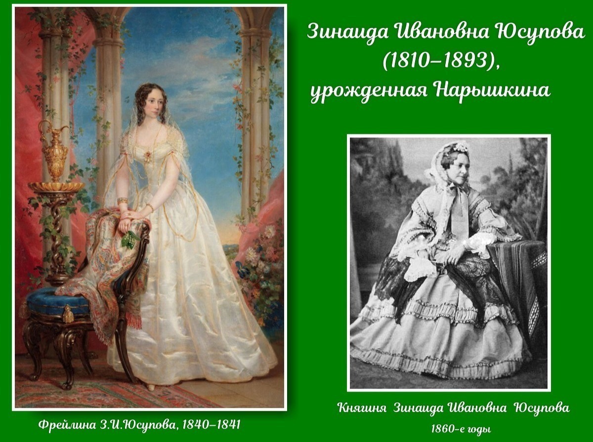Княгиня Зинаида Ивановна Юсупова, урождённая Нарышкина (2 ноября 1810, Москва — 16 октября 1893, Булонь-Бийанкур) — русская аристократка, фрейлина, известная светская львица XIX века. Её отцом был камергер Иван Дмитриевич Нарышкин, матерью — Варвара Николаевна Ладомирская, внебрачная дочь фаворита императрицы Екатерины II Ивана Римского-Корсакова и графини Екатерины Строгановой.