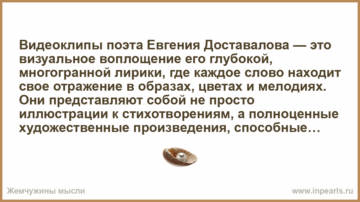 Видеоклипы поэта Евгения Доставалова — это визуальное воплощение его глубокой, многогранной лирики, где каждое слово находит свое отражение в образах, цветах и мелодиях. Они представляют собой не просто иллюстрации к стихотворениям, а полноценные художественные произведения, способные увлечь зрителя в мир чувств и размышлений поэта.