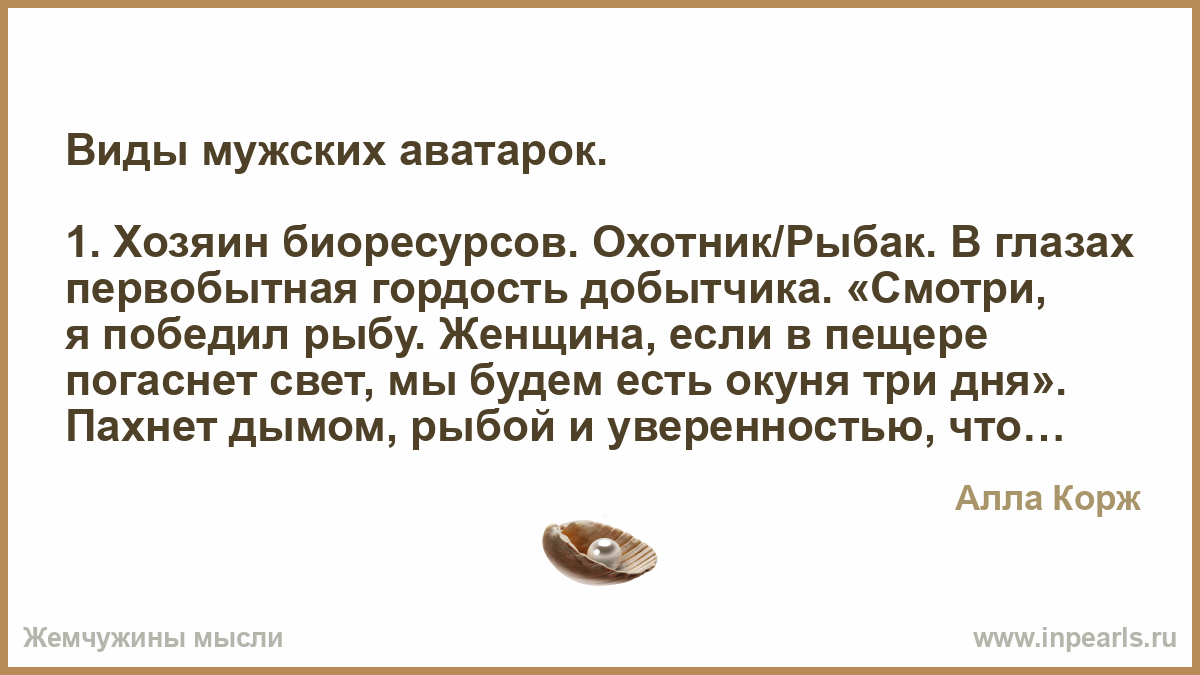 1. Хозяин биоресурсов. Охотник/Рыбак. В глазах первобытная гордость добытчика. «Смотри, я победил рыбу. Женщина, если в пещере погаснет свет, мы будем есть окуня три дня». Пахнет дымом, рыбой и уверенностью, что людям нужен не психолог, а лодка.