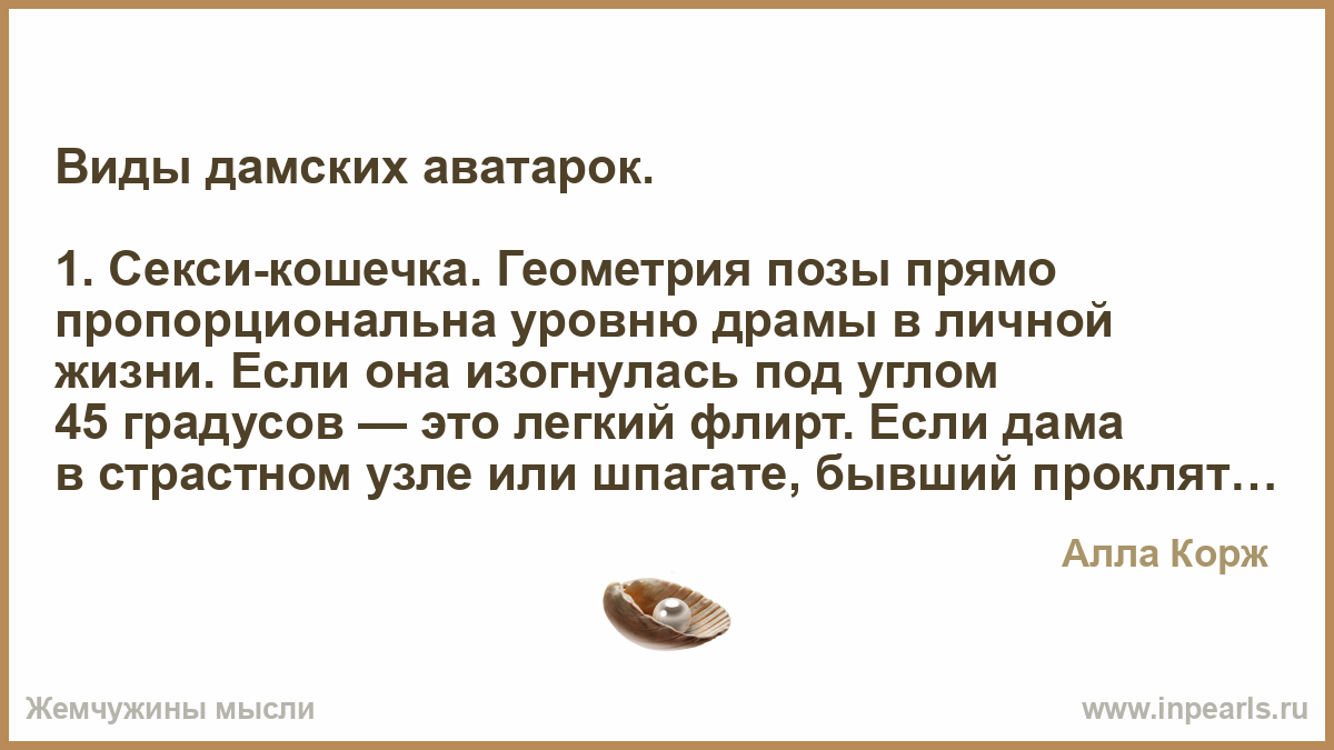 1. Секси-кошечка. Геометрия позы прямо пропорциональна уровню драмы в личной жизни. Если она изогнулась под углом 45 градусов — это легкий флирт. Если дама в страстном узле или шпагате, бывший проклят по седьмое колено, и мы её в этом поддерживаем.