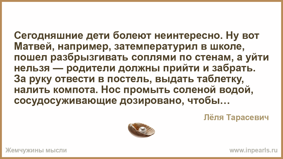 Сегодняшние дети болеют неинтересно. Ну вот Матвей, например, затемпературил в школе, пошел разбрызгивать соплями по стенам, а уйти нельзя — родители должны прийти и забрать. За руку отвести в постель, выдать таблетку, налить компота. Нос промыть соленой водой, сосудосуживающие дозировано, чтобы не вызвать привыкания. Антибиотик по назначению врача. Комнату проветривать, влажность поддерживать, лишний раз не кутать. Помнить, что через неделю должно само пройти. Ну или через семь дней.