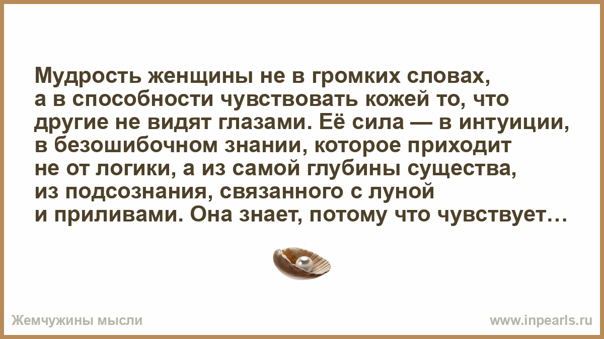 Мудрость женщины не в громких словах, а в способности чувствовать кожей то, что другие не видят глазами. Её сила — в интуиции, в безошибочном знании, которое приходит не от логики, а из самой глубины существа, из подсознания, связанного с луной и приливами. Она знает, потому что чувствует.