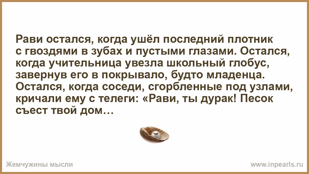 Рави остался, когда ушёл последний плотник с гвоздями в зубах и пустыми глазами. Остался, когда учительница увезла школьный глобус, завернув его в покрывало, будто младенца. Остался, когда соседи, сгорбленные под узлами, кричали ему с телеги: «Рави, ты дурак! Песок съест твой дом!».