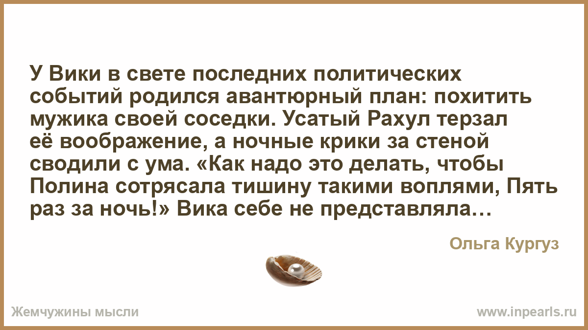 У Вики в свете последних политических событий родился авантюрный план: похитить мужика своей соседки. Усатый Рахул терзал её воображение, а ночные крики за стеной сводили с ума. «Как надо это делать, чтобы Полина сотрясала тишину такими воплями, Пять раз за ночь!» Вика себе не представляла. Её Игорёк вырубался на третьей минуте, а тут… Вика не спала ночами, разрабатывала план похищения. Она пообещала щедро вознаградить Славку, школьного приятеля, за то, что он усыпит бдительность Полины и переключит её потенциал на себя. « Задача сложная, но выполнимая»,- после размышлений анонсировал своё решение Славка. «Сто баксов». На том и порешили. Каждый вечер встречал он Полю в подъезде, «строил глазки». выразительно вздыхал и пытался ущипнуть за толстый зад. Наконец, пригласил её домой «на чашечку кофе». И… завертелось. Крики за стеной прекратились. Только ночной сон «сдабривался» храпом Игорька, работавшего курьером ВкусВилл. «Пол дела сделано, теперь — убрать мужа. Но, куда? « Думай, Вика, думай. «Мать». Вера Григорьевна была тучной, неповоротливой особой. Гололёд. И… мама… Вика снарядила в «экспедицию» мужа. «Поживи там немного, — утирая непрошенную слезу, сказала Вика.- Мать — это святое». Деньги, отложенные на отдых, пошли на наём исполнителей спецоперации. Когда Рахул вышел вынести мусор в шлёпках и в спортивном костюме, его скрутили и отвели на знакомый этаж, только в соседнюю квартиру. Там ждала его Вика в эротическом «исполнении»; правда, Рахул не сразу понял, что от него требуют. Деньжатами гастарбайтер ещё не разжился, но очумелый вид Вики говорил сам за себя. «Бери меня…» Он мог. Живя в Индии, освоил науку, о которой не помышляли местные жители российского региона. Вика орала так, что соседи напротив вызвали полицию, решив, что Вику убивают. В полиции заявили, что если будет труп, тогда приедем, а в семейные разборки мы не вмешиваемся. Соседи остолбенели, когда от Вики вышел молодой индус в спортивном костюме и ключом открыл соседнюю дверь. « А что, так можно?» — задала себе вопрос 50-летняя Клавдия Петровна, соседка напротив. В её голове рождался план. Какой? Очевидно же…