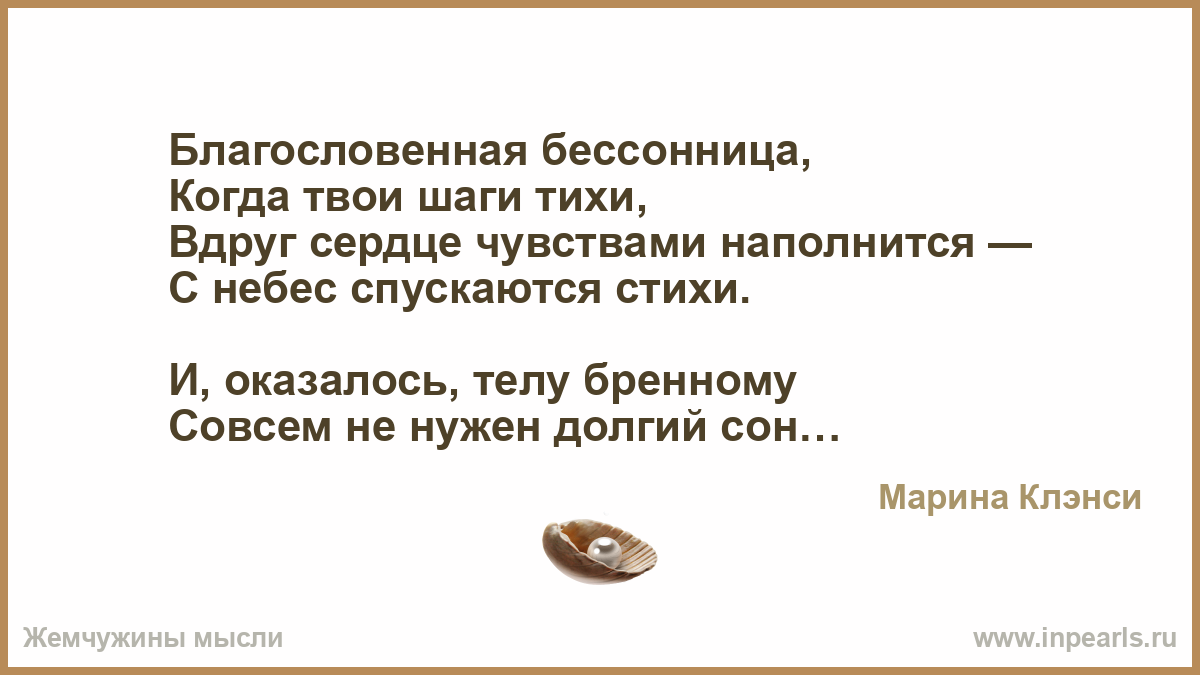 Им днём не достучаться до тебя, В делах, в заботах вся ты. И терпеливо ждут они тогда Ночь, где останешься одна ты. Чтоб вылить наболевшее тебе, И горестей минуты, и минуты счастья. И легче станет СЕРДЦУ и ДУШЕ твоей, Тебе ж грозит-с бессонницей остаться…