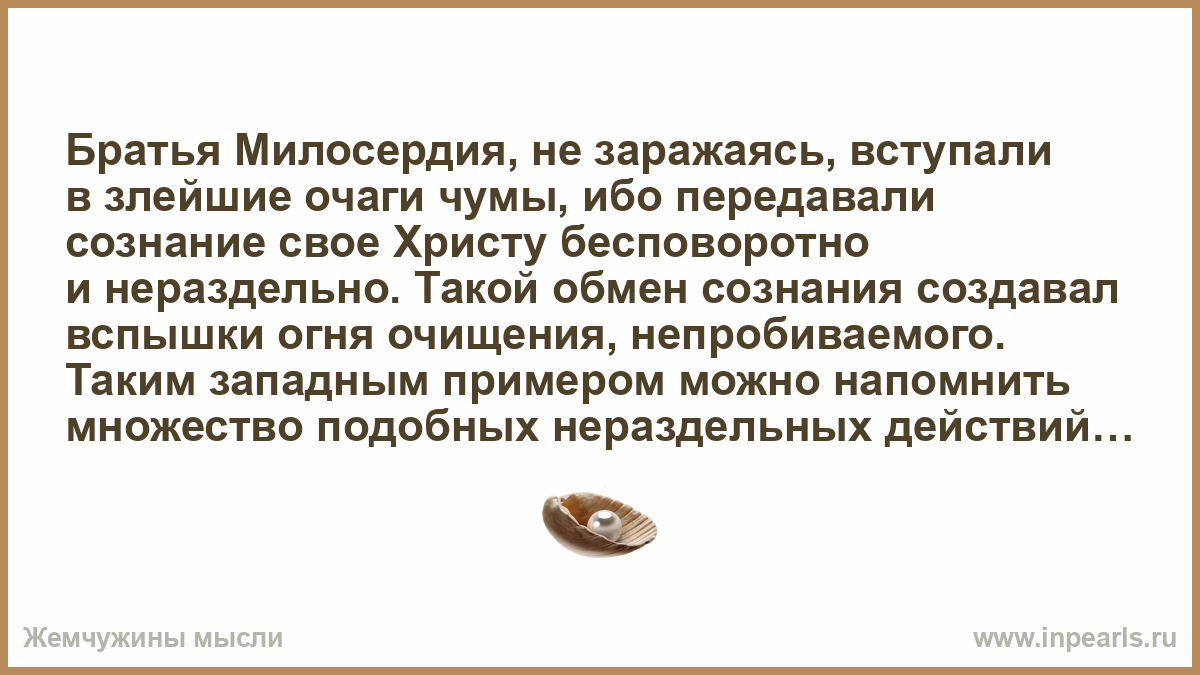 Братья Милосердия, не заражаясь, вступали в злейшие очаги чумы, ибо передавали сознание свое Христу бесповоротно и нераздельно. Такой обмен сознания создавал вспышки огня очищения, непробиваемого. Таким западным примером можно напомнить множество подобных нераздельных действий, вызывающих огонь напряжения сердца.