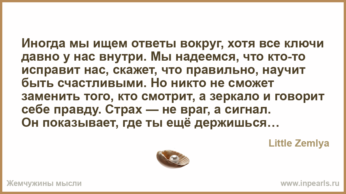 Иногда мы ищем ответы вокруг, хотя все ключи давно у нас внутри. Мы надеемся, что кто-то исправит нас, скажет, что правильно, научит быть счастливыми. Но никто не сможет заменить того, кто смотрит, а зеркало и говорит себе правду. Страх — не враг, а сигнал. Он показывает, где ты ещё держишься за старое. Где боишься потерять то, что давно yже не твоё. Поняв это, страх перестаёт управлять тобой. Чаще всего мы мучаем себя не от обстоятельств, а от мыслей о них. Мы накручиваем сценарии, которые никогда не произойдут. Учись отпускать истории, которые создает твоя голова! Сила не в том, чтобы всегда быть правым, сила в том, чтобы видеть свои ошибки, признавать их и идти дальше без самобичевания. И помни: ты не обязан всем нравится, всем помогать, всем объяснять. Главное быть честным с собой!