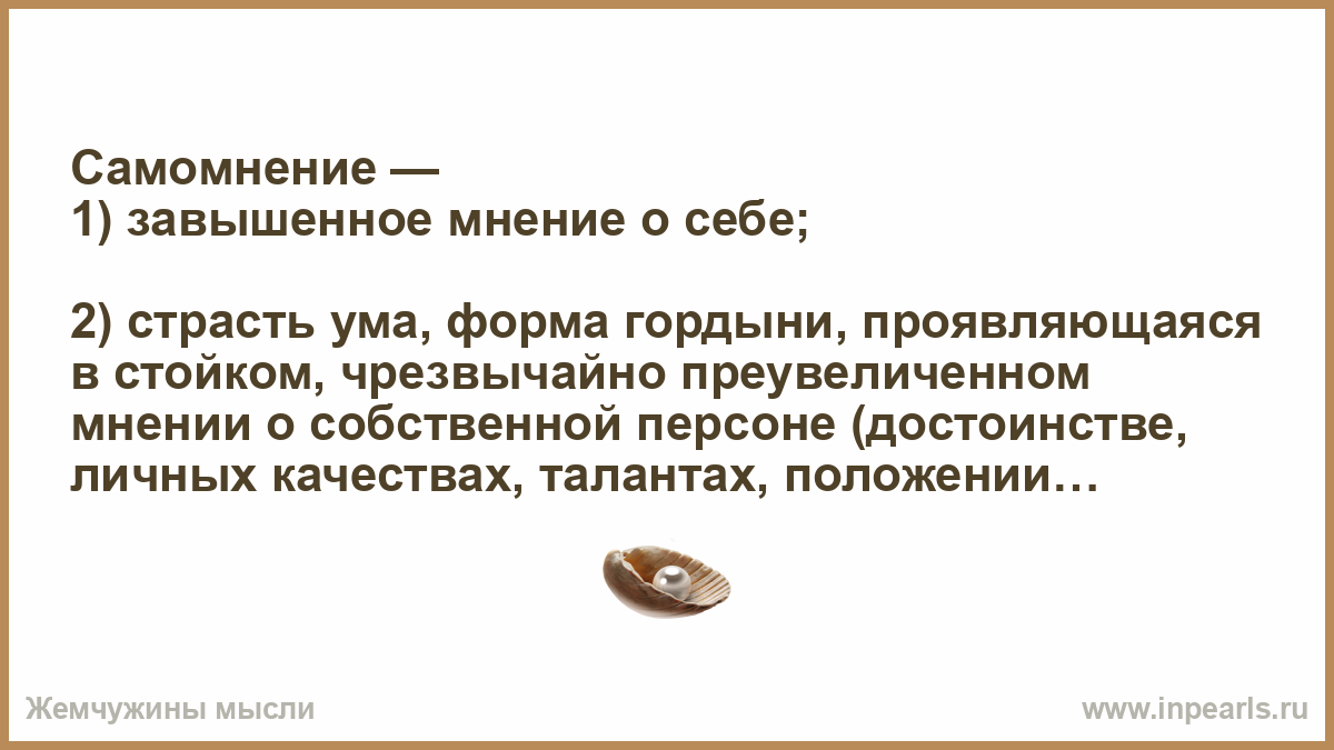 2) страсть ума, форма гордыни, проявляющаяся в стойком, чрезвычайно преувеличенном мнении о собственной персоне (достоинстве, личных качествах, талантах, положении в обществе и даже «добродетелях».