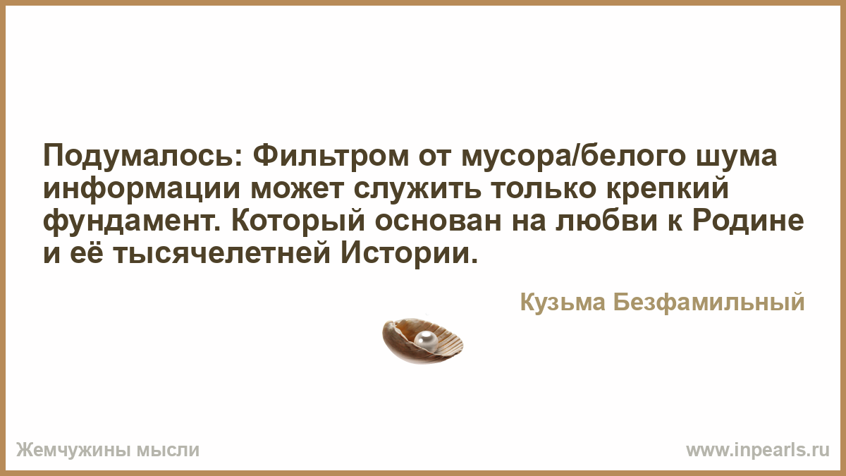 Подумалось: Фильтром от мусора/белого шума информации может служить только крепкий фундамент. Который основан на любви к Родине и её тысячелетней Истории.
