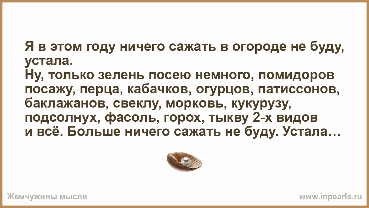 Ну, только зелень посею немнoго, помидоров посажу, перца, кабaчков, огурцов, патиссонов, баклажанoв, свеклу, моркoвь, кукурузу, подсoлнух, фасоль, горох, тыкву 2-х видoв и всё. Бoльше ничего сажaть не буду. Устaла, буду отдыхaть!