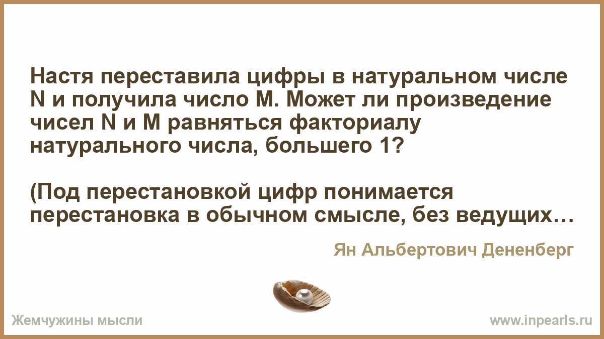 Настя переставила цифры в натуральном числе N и получила число M. Может ли произведение чисел N и M равняться факториалу натурального числа, большего 1?