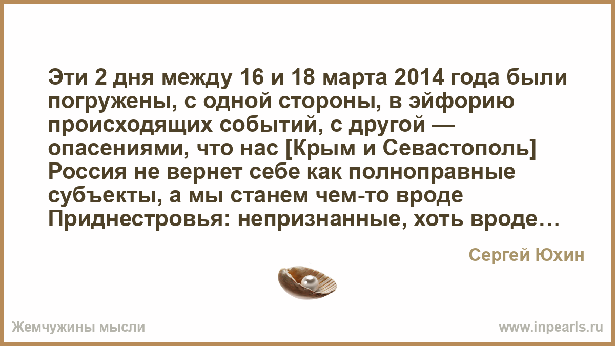 Эти 2 дня между 16 и 18 марта 2014 года были погружены, с одной стороны, в эйфорию происходящих событий, с другой — опасениями, что нас [Крым и Севастополь] Россия не вернет себе как полноправные субъекты, а мы станем чем-то вроде Приднестровья: непризнанные, хоть вроде и свои.
