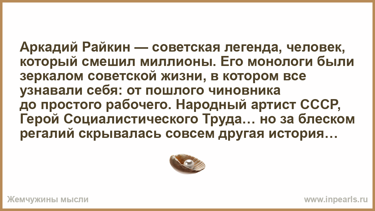 Аркадий Райкин — советская легенда, человек, который смешил миллионы. Его монологи были зеркалом советской жизни, в котором все узнавали себя: от пошлого чиновника до простого рабочего. Народный артист СССР, Герой Социалистического Труда… но за блеском регалий скрывалась совсем другая история.