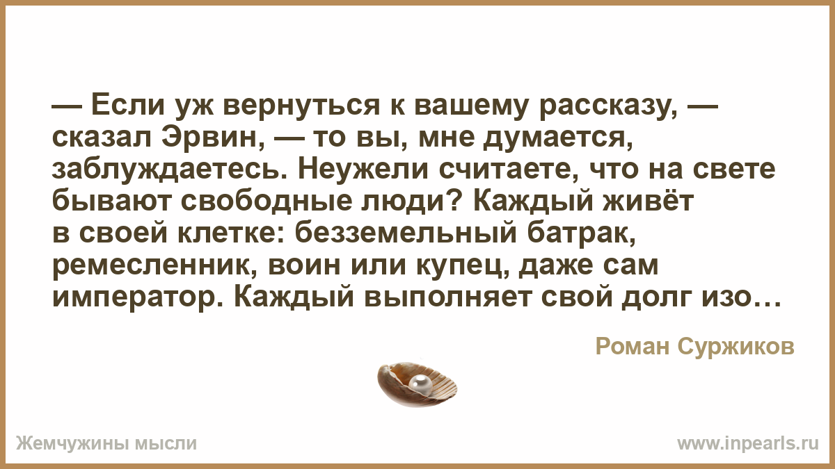 — Если уж вернуться к вашему рассказу, — сказал Эрвин, — то вы, мне думается, заблуждаетесь. Неужели считаете, что на свете бывают свободные люди? Каждый живёт в своей клетке: безземельный батрак, ремесленник, воин или купец, даже сам император. Каждый выполняет свой долг изо дня в день: забивает сваи, стрижки овец, рубит головы, усмиряет вассалов, угадывает и душит заговоры, ведёт войны, ходит в дурацкие экспедиции… Я не встречал человека, который сам выбирал бы, как ему жить.