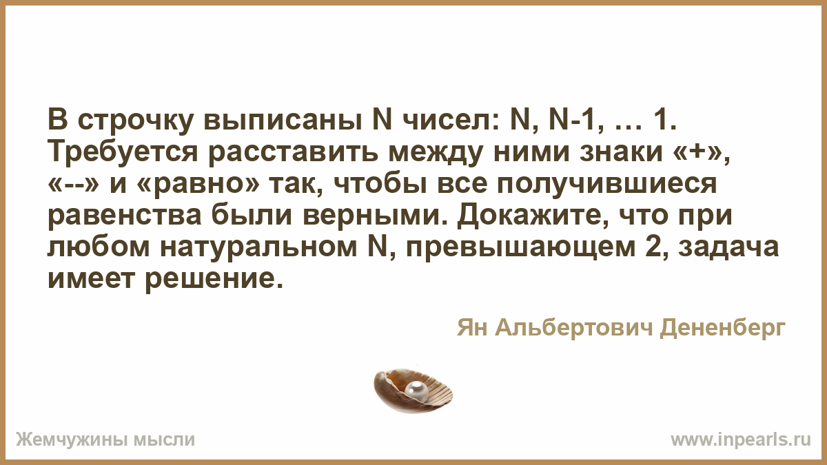 В строчку выписаны N чисел: N, N-1, … 1. Требуется расставить между ними знаки «+», «--» и «равно» так, чтобы все получившиеся равенства были верными. Докажите, что при любом натуральном N, превышающем 2, задача имеет решение.