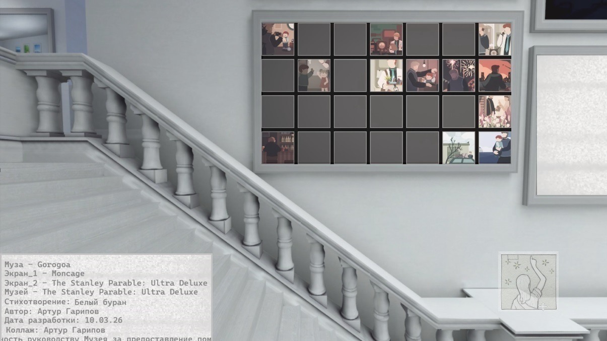 Кадры для изготовления коллажа взяты во время прохождения трёх видеоигр-головоломок: Gorogoa, Moncage, The Stanley Parable: Ultra Deluxe.