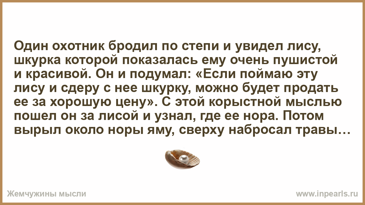 Один охотник бродил по степи и увидел лису, шкурка которой показалась ему очень пушистой и красивой. Он и подумал: «Если поймаю эту лису и сдеру с нее шкурку, можно будет продать ее за хорошую цену». С этой корыстной мыслью пошел он за лисой и узнал, где ее нора. Потом вырыл около норы яму, сверху набросал травы и поверх травы положил какую-то падаль дли приманки. А сам спрятался неподалеку.