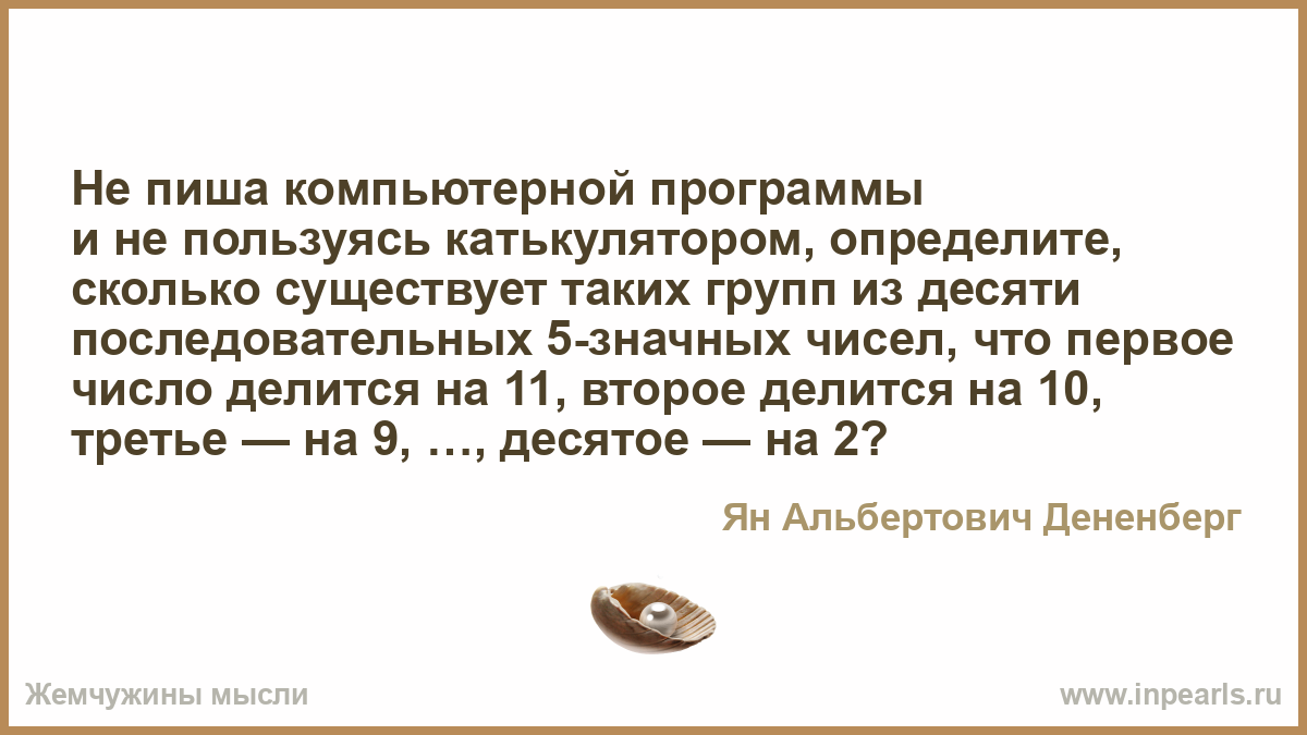 Не пиша компьютерной программы и не пользуясь катькулятором, определите, сколько существует таких групп из десяти последовательных 5-значных чисел, что первое число делится на 11, второе делится на 10, третье — на 9, …, десятое — на 2?