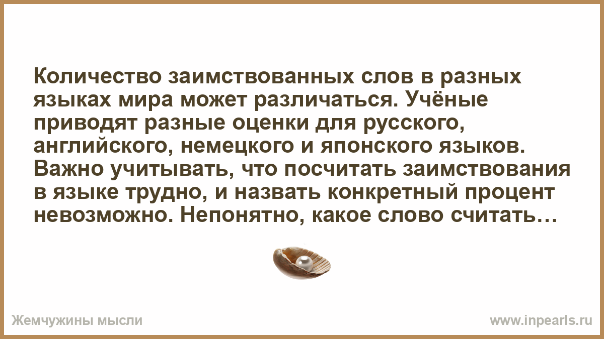 Количество заимствованных слов в разных языках мира может различаться. Учёные приводят разные оценки для русского, английского, немецкого и японского языков. Важно учитывать, что посчитать заимствования в языке трудно, и назвать конкретный процент невозможно. Непонятно, какое слово считать заимствованным.