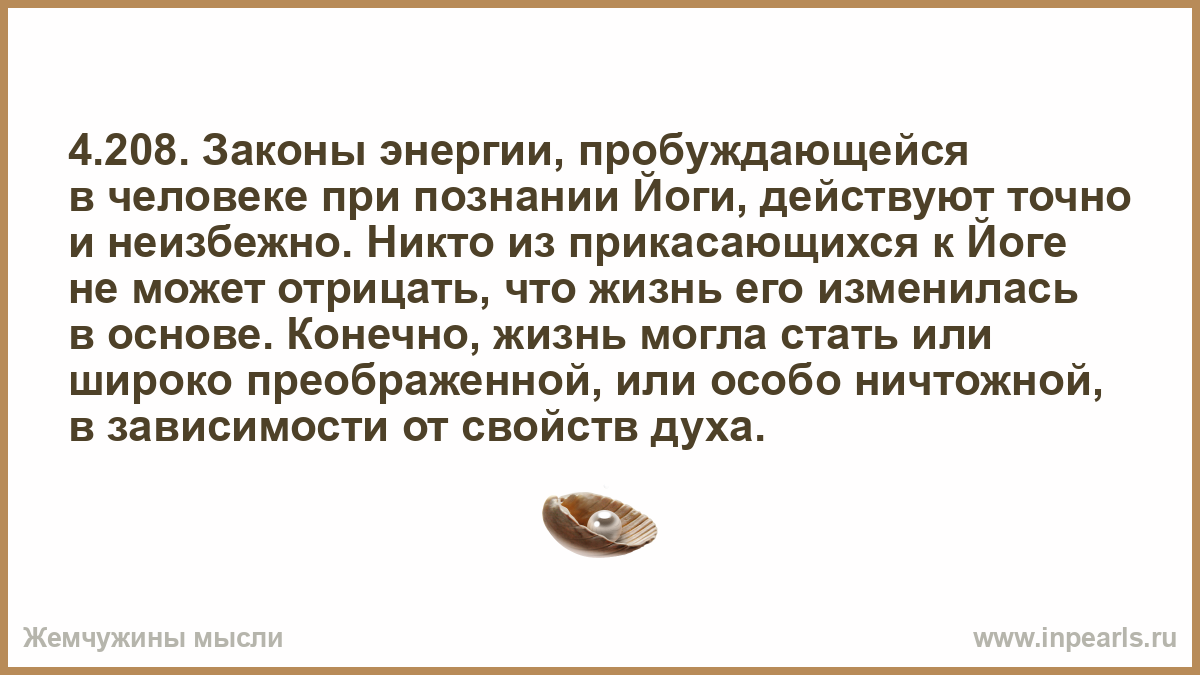 4.208. Законы энергии, пробуждающейся в человеке при познании Йоги, действуют точно и неизбежно. Никто из прикасающихся к Йоге не может отрицать, что жизнь его изменилась в основе. Конечно, жизнь могла стать или широко преображенной, или особо ничтожной, в зависимости от свойств духа.