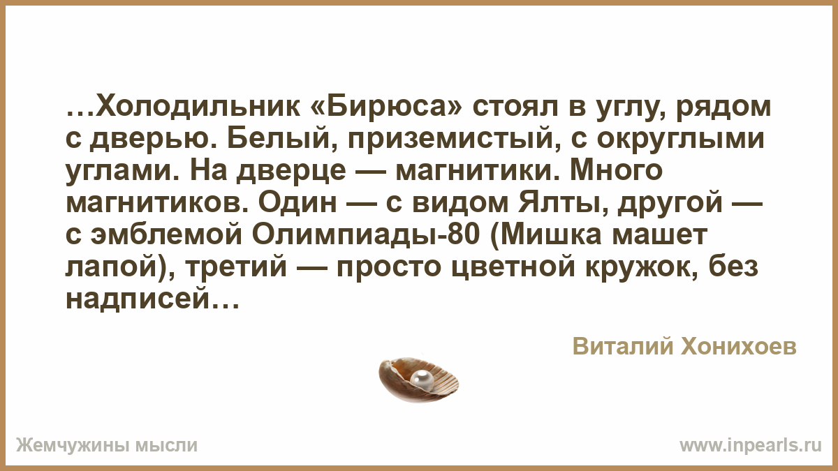 …Холодильник «Бирюса» стоял в углу, рядом с дверью. Белый, приземистый, с округлыми углами. На дверце — магнитики. Много магнитиков. Один — с видом Ялты, другой — с эмблемой Олимпиады-80 (Мишка машет лапой), третий — просто цветной кружок, без надписей.