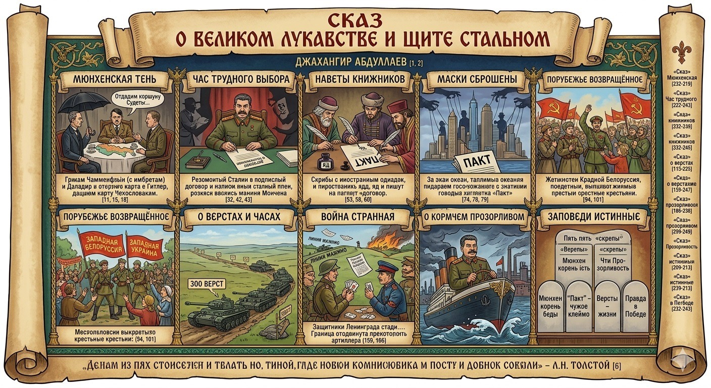 Слушай же, добрый молодец, венец нашего Сказа. Теперь, когда вехи расставлены и версты сосчитаны, пора сказать о том, чья рука то перо держала и чья воля, аки скала, против бури мировой стояла. В ту пору предгрозовую, когда мир в лукавстве тонул, стоял у власти Иосиф Виссарионович.