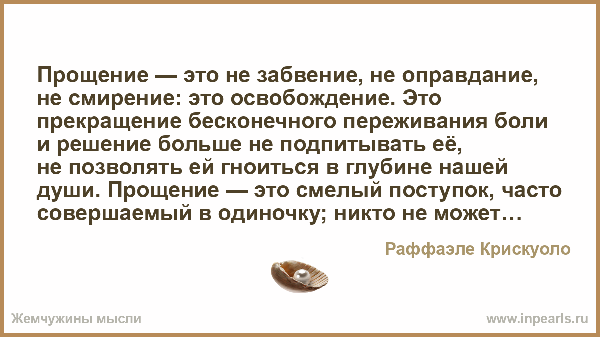 Прощение — это не забвение, не оправдание, не смирение: это освобождение. Это прекращение бесконечного переживания боли и решение больше не подпитывать её, не позволять ей гноиться в глубине нашей души. Прощение — это смелый поступок, часто совершаемый в одиночку; никто не может простить за нас, и только мы сами можем принять это решение. Когда это происходит, и мы позволяем себе отпустить, всё меняется: наш взгляд смещается, дыхание меняется, темп меняется. Это внутренняя трансформация, которая способна преобразить мир вокруг нас, изменить отношения, молчание и дистанцию.