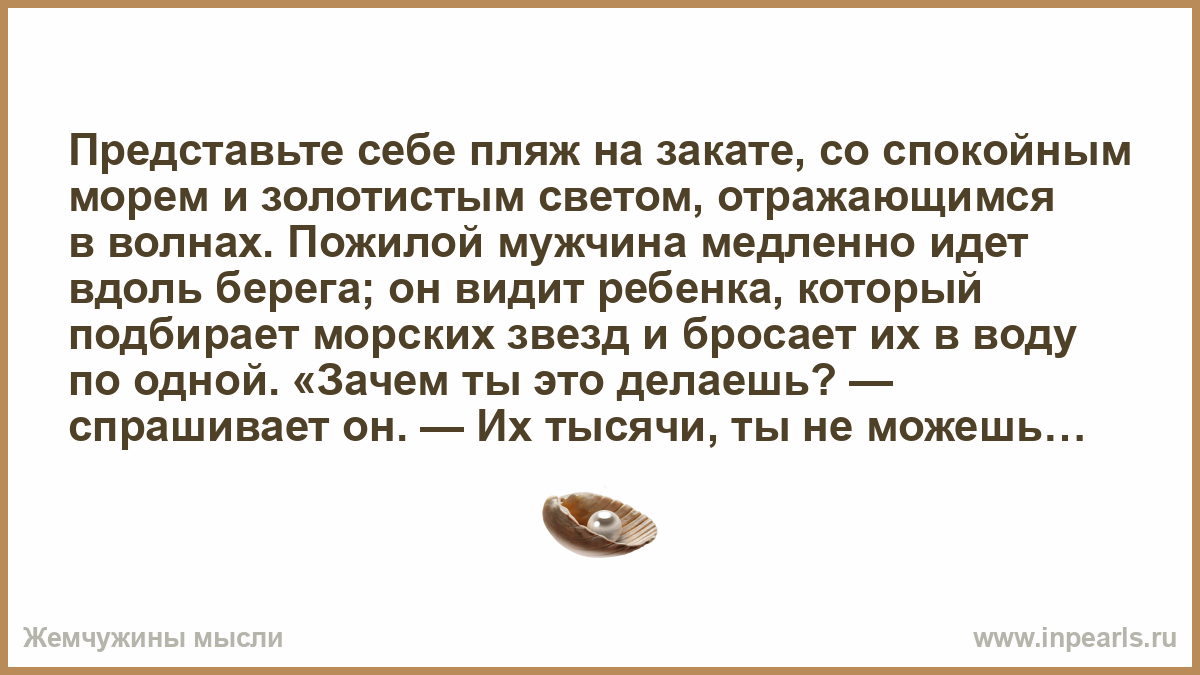 Представьте себе пляж на закате, со спокойным морем и золотистым светом, отражающимся в волнах. Пожилой мужчина медленно идет вдоль берега; он видит ребенка, который подбирает морских звезд и бросает их в воду по одной. «Зачем ты это делаешь? — спрашивает он. — Их тысячи, ты не можешь спасти их всех». И ребенок, не останавливаясь, отвечает: «Эту можно спасти»; и он бросает в море еще одну. Это маленькое живое существо, как и каждая спасенная жизнь, не знает, что оно часть числа, но понимает, что вернулось домой.