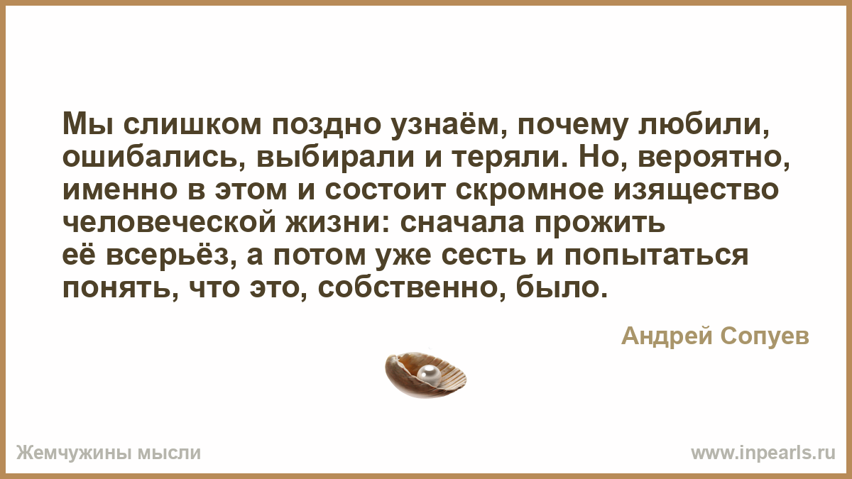 Мы слишком поздно узнаём, почему любили, ошибались, выбирали и теряли. Но, вероятно, именно в этом и состоит скромное изящество человеческой жизни: сначала прожить её всерьёз, а потом уже сесть и попытаться понять, что это, собственно, было.
