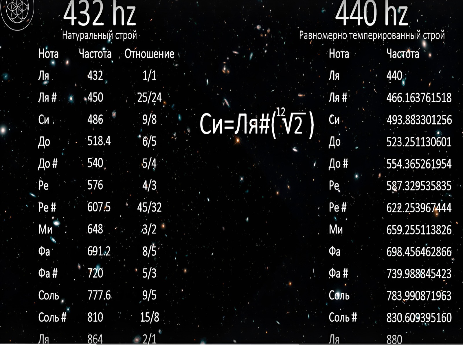 Как известно, в основе музыкального строя лежит частота. Наука киматика, изучающая визуализацию звука и вибрации, доказывает, что частота и вибрация являются мастер-ключами и организационной основой для создания всей материи и жизни на этой планете.