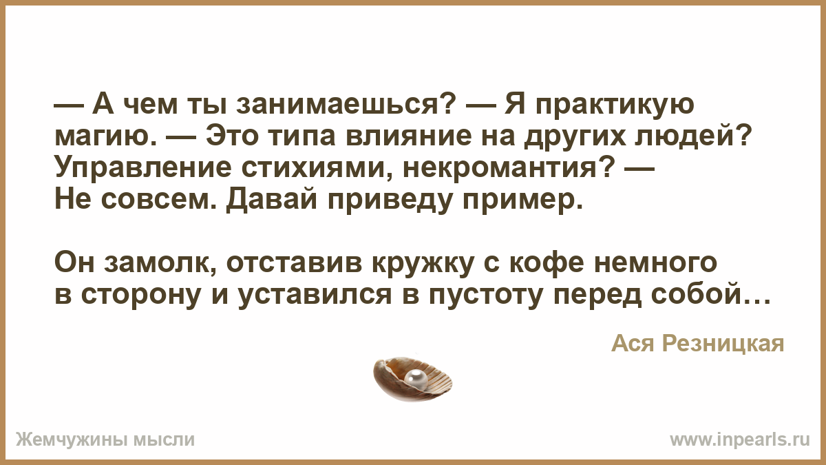 — А чем ты занимаешься? — Я практикую магию. — Это типа влияние на других людей? Управление стихиями, некромантия? — Не совсем. Давай приведу пример.