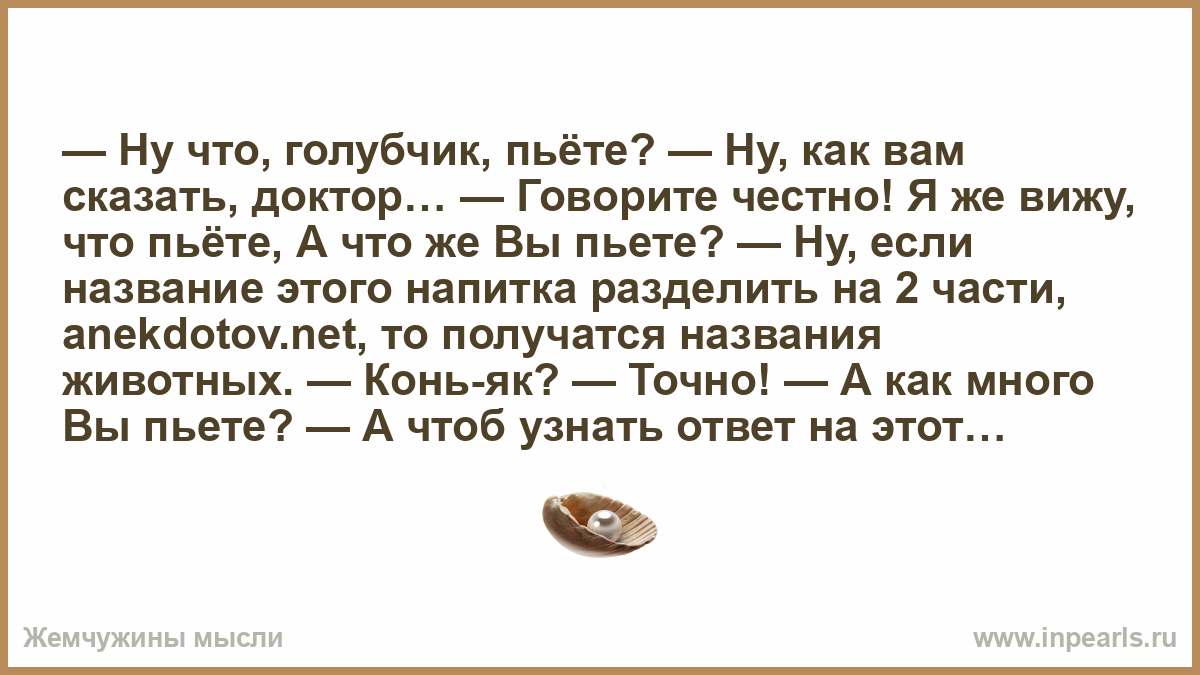 — Ну что, голубчик, пьёте? — Ну, как вам сказать, доктор… — Говорите честно! Я же вижу, что пьёте, А что же Вы пьете? — Ну, если название этого напитка разделить на 2 части, anekdotov.net, то получатся названия животных. — Конь-як? — Точно! — А как много Вы пьете? — А чтоб узнать ответ на этот вопрос — поменяйте животных местами..
